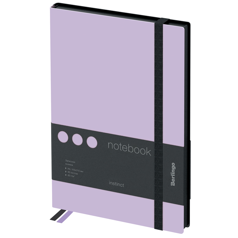 Записные книжки Berlingo Instinct изготовлены из матовой искусственной кожи c эффектом soft-touch. Сочетание двух контрастных цветов обложки: пастельного фиолетового и черного. Полужесткая обложка с прострочкой по корешку. Черный срез блока. Вертикальная черная фиксирующая резинка увеличенной ширины 9мм. Запечатанные форзацы. Внутренний блок из 80 листов высококачественной кремовой бумаги повышенной плотности 80 г/м?, пантонная печат, перфорированные уголки. Индивидуальная упаковка. Подходят под персонализацию.