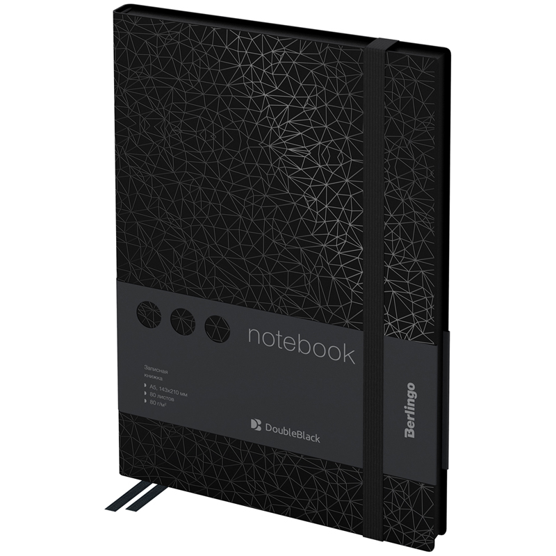 Стильные записные книжки Berlingo "DoubleBlack" с полужесткой обложкой из высококачественного soft-touch кожзаменителя с черным срезом. Вертикальная фиксирующая резинка увеличенной толщины 9мм. Цвет обложки - черный. Имиджевый рисунок лаком по всей площади обложки. Внутренний карман для хранения заметок и мелочей. Внутренний блок из 80 листов высокачественной кремовой бумаги повышенной плотности 80 г/м. Перфорированные уголки блока. 2 закладки-ляссе. Прошитый блок. Подходит под персонализацию.