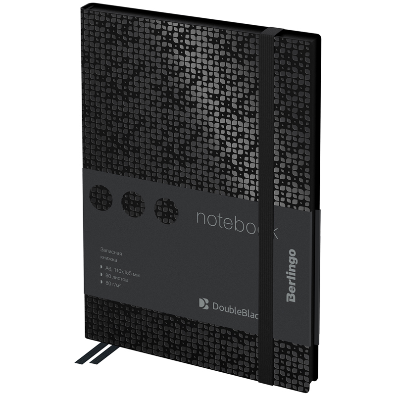 Стильные записные книжки Berlingo "DoubleBlack" с полужесткой обложкой из высококачественного soft-touch кожзаменителя с черным срезом. Вертикальная фиксирующая резинка увеличенной толщины 9мм. Цвет обложки - черный. Имиджевый рисунок лаком по всей площади обложки. Внутренний карман для хранения заметок и мелочей. Внутренний блок из 80 листов высокачественной кремовой бумаги повышенной плотности 80 г/м. Перфорированные уголки блока. 2 закладки-ляссе. Прошитый блок. Подходит под персонализацию.