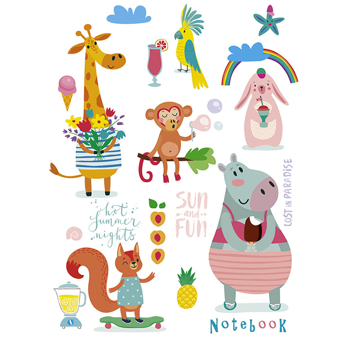 Записная книжка детская, 64 листа, формат А6. Внутренний блок - белая офсетная бумага, плотность 65 гр/м2, стилизованная линовка, высечка 4 раздела. Обложка мелованный картон полноцветная печать. Крепление - скоба.