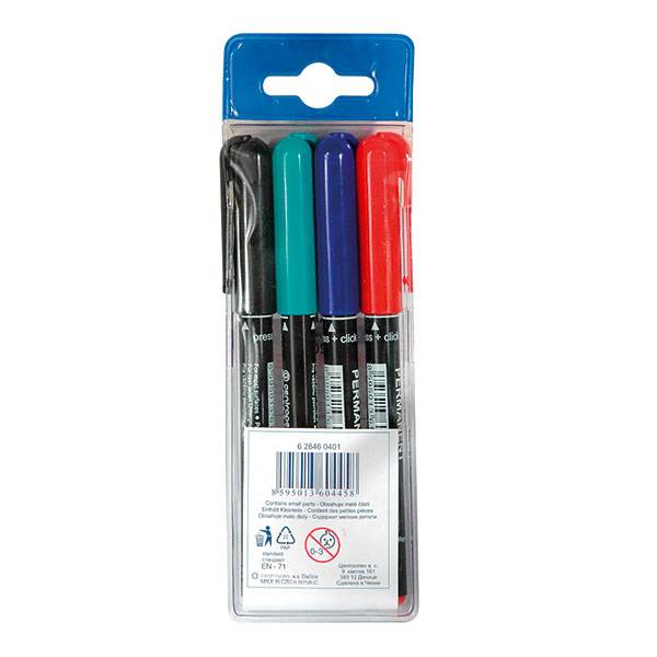 Набор перманентных маркеров CENTROPEN позволяет писать практически на любых поверхностях: стекле, пленках, пластмассе. Маркеры можно использовать для нанесения напдписей, заголовков, на которые стоит обратить внимание. Цвет и насыщенность линий не выцветает и не тускнеет со временем. Маркер устойчив к стиранию, воде и атмосферным воздействиям. Спиртовой состав чернил. Круглый наконечник позволяет провести линию толщиной 1 мм. В наборе четыре цвета: красный, синий, зеленый, черный.