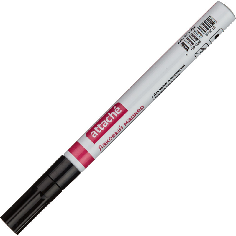 Маркер лаковый Attache черный (Толщина линии письма 2 мм) предназначен для непрозрачной маркировки практически всех материалов, например, стекла, пластика, дерева или металла. Чернила маркера с лакирующим эффектом. Водостойкий, быстро сохнет. Поток чернил регулируется клапаном. Алюминиевый корпус. Толщина линии — 2мм. Наконечник изготовлен из Японского качественного материала. Инструкция по применению маркера: 1. Перед использованием хорошенько встряхнуть с закрытым колпачком. 2. Снимите колпачок, прижмите наконечник к поверхности, надавите и удерживайте пока не проступит краска. 3. Применять после того как убедитесь, что вытекает исходный цвет. Предостережения: плотно закрывайте колпачок после применения, держать маркер вдали от огня, прямые солнечные лучи вызывают обесцвечивание