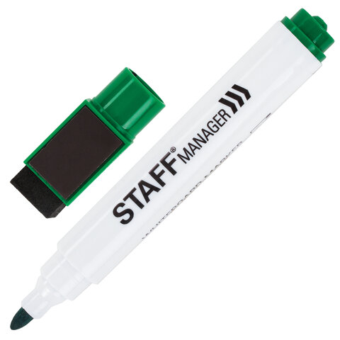 Маркер стираемый для белой доски на магните со стирателем, ЗЕЛЕНЫЙ, STAFF "Manager", 3 мм, 152005