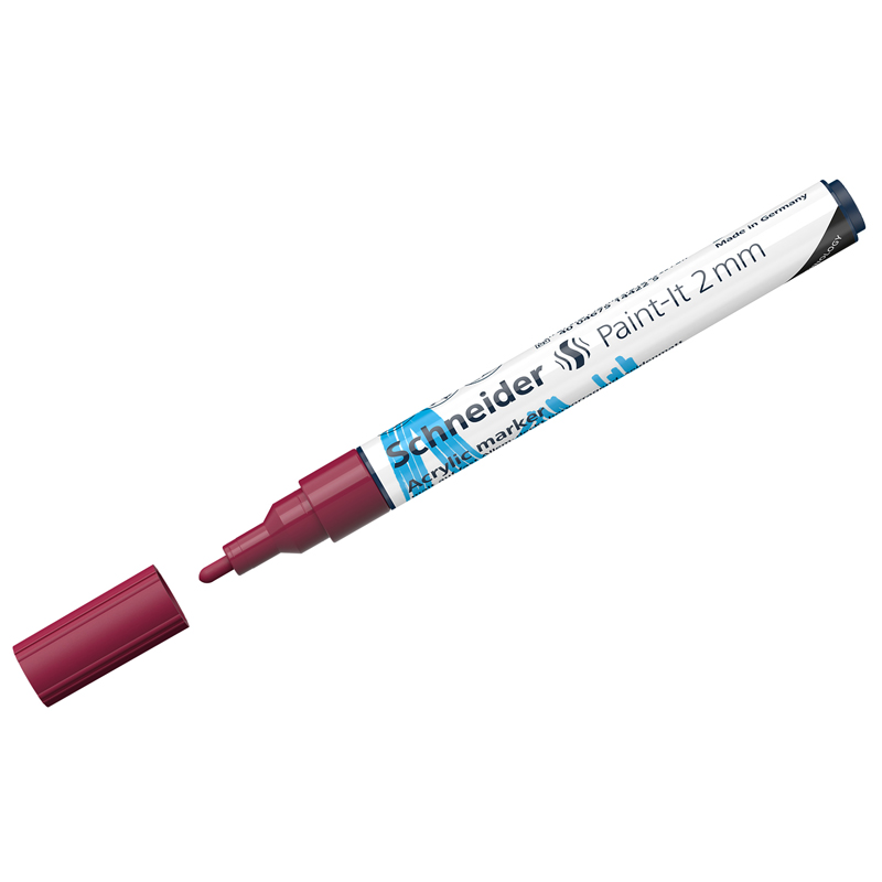 Schneider Paint-It 310 - акриловый маркер для творчества и хобби. Толщина линии – 2 мм, форма наконечника – пулевидная, цвет чернил - бордовый. Акриловые чернила на водной основе быстро сохнут, обеспечивают интенсивность цвета, высокие укрывные свойства и стойкость после высыхания. Не содержат ксилол и толуол. Подходит для работ на различных поверхностях: бумага, дерево, камень, гипс и т.д. Перед использованием маркер необходимо встряхнуть для смешивания и равномерной подачи чернил. • Цвет чернил: бордовый, • Толщина линии письма: 2 мм, • Страна производства: Германия
