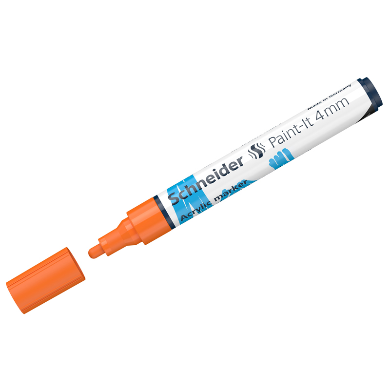 Schneider Paint-It 320 - акриловый маркер для творчества и хобби. Толщина линии – 4 мм, форма наконечника – пулевидная, цвет чернил - оранжевый. Акриловые чернила на водной основе быстро сохнут, обеспечивают интенсивность цвета, высокие укрывные свойства и стойкость после высыхания. Не содержат ксилол и толуол. Подходит для работ на различных поверхностях: бумага, дерево, камень, гипс и т.д. Перед использованием маркер необходимо встряхнуть для смешивания и равномерной подачи чернил. • Цвет чернил: оранжевый, • Толщина линии письма: 4 мм, • Страна производства: Германия