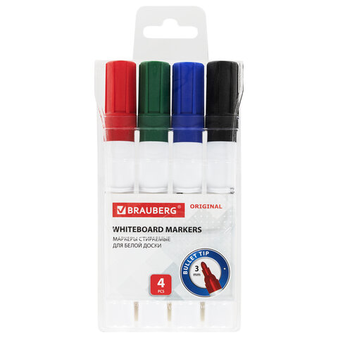 Маркеры стираемые для белой доски НАБОР 4 ЦВЕТА, BRAUBERG "ORIGINAL", 3 мм, 152120