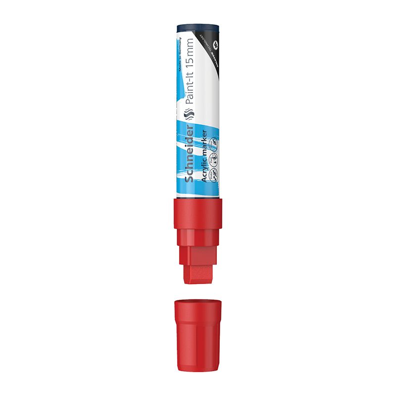 Schneider Paint-It 330 - акриловый маркер для творчества и хобби. Толщина линии – 15 мм, форма наконечника – прямоугольная, цвет чернил - красный. Акриловые чернила на водной основе быстро сохнут, обеспечивают интенсивность цвета, высокие укрывные свойства и стойкость после высыхания. Не содержат ксилол и толуол. Подходит для работ на различных поверхностях: бумага, дерево, камень, гипс и т.д. Перед использованием маркер необходимо встряхнуть для смешивания и равномерной подачи чернил. • Цвет чернил: красный, • Толщина линии письма: 15 мм, • Страна производства: Германия