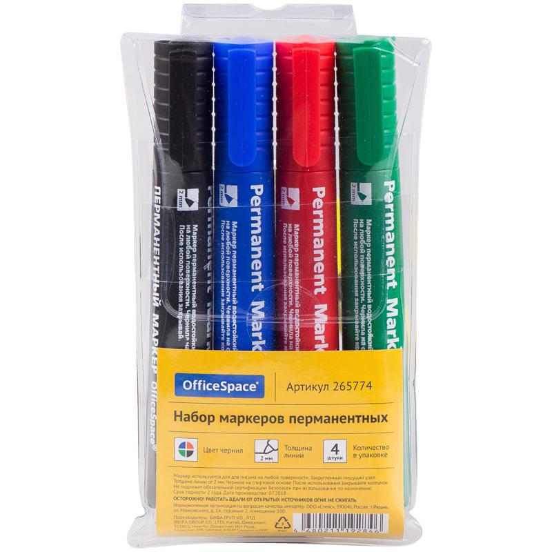Набор маркеров перманентных OfficeSpace "8004", 4цв., пулевидный, 2мм, чехол с европодвесом. 265774