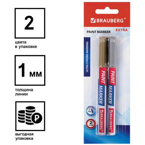 Маркер-краска лаковый EXTRA (paint marker) 1 мм, НАБОР 2 цвета, ЗОЛОТОЙ/СЕРЕБРЯНЫЙ, BRAUBERG, 151989