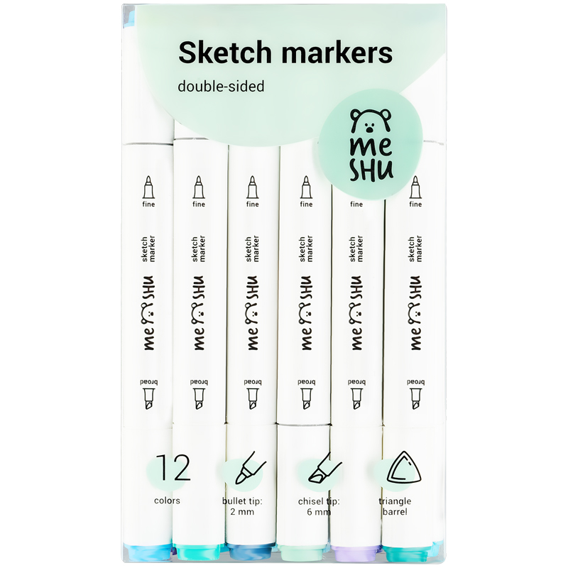Набор двусторонних маркеров для скетчинга Meshu - идеальный выбор для художников, дизайнеров, иллюстраторов и любителей скетчинга, подходят для создания анимэ и манги. Эргономичный трехгранный корпус удобно лежит в руке и позволяет эффективно прорабатывать мелкие детали рисунка. Чернила на спиртовой основе - быстро высыхают, водостойкие, нетоксичны и не портят поверхность бумаги. Маркеры обладают пулевидным (2мм) и скошенным (6 мм) наконечниками, что позволяет прорабатывать как мелкие детали рисунка. так и закрашивать большие области.
