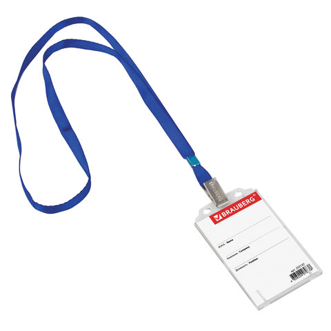 Бейдж вертикальный (85х55 мм), на синей ленте 45 см, твердый пластик, BRAUBERG, 232139