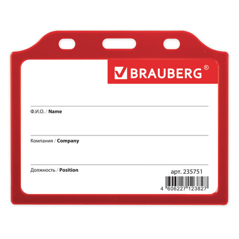 Бейдж горизонтальный жесткокаркасный (75х105 мм), без держателя, КРАСНЫЙ, BRAUBERG, 235751