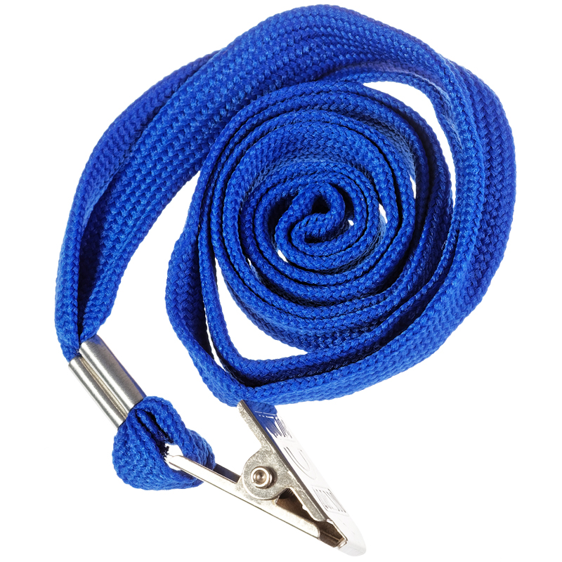 Съемный текстильный шнурок крепится к бейджу с помощью металлической клипсы. Цвет шнурка - синий.