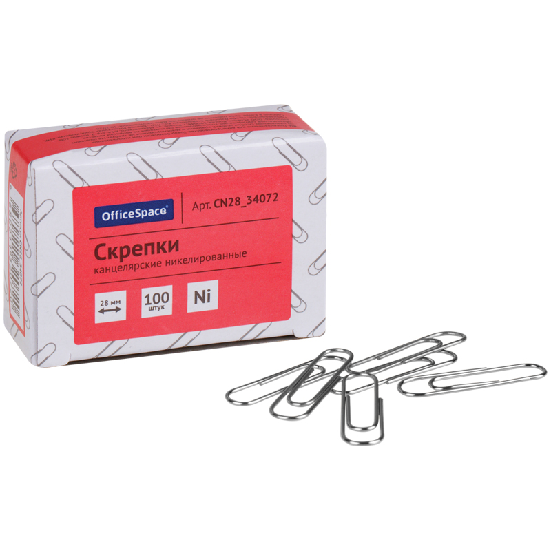 Скрепки 28мм, OfficeSpace, 100шт., никелированные, карт. упак.