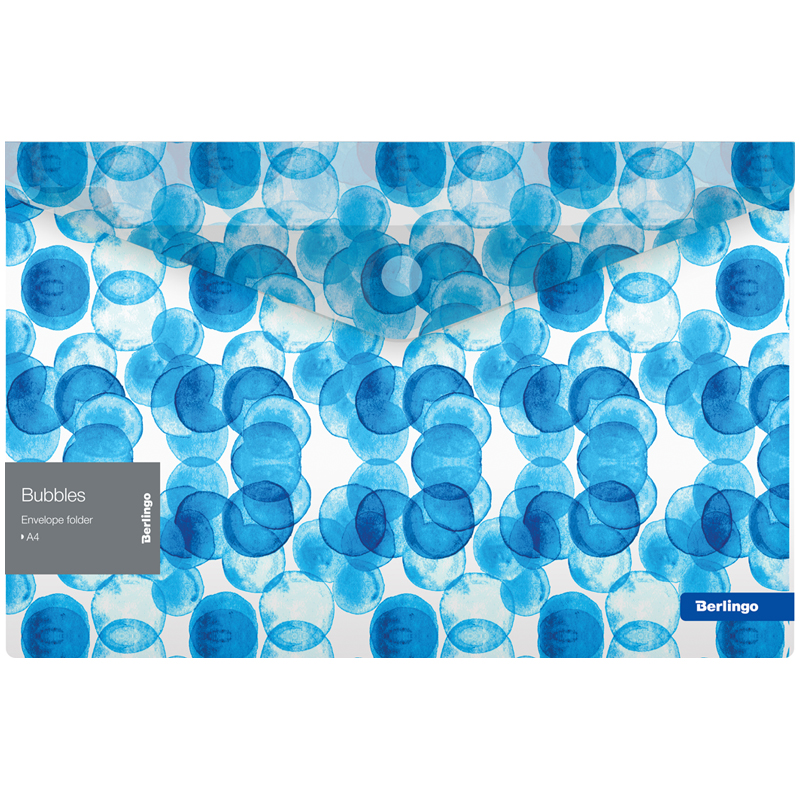 Папка-конверт пластиковая на липучке Berlingo "Bubbles" формата А4, полупрозрачная с рисунком. Надежная застежка-липучка синего цвета. Быстрый доступ к документам. Изготовлена из высококачественного полипропилена с матовой текстурой поверхности "апельсиновая корка", на которой не видно отпечатков пальцев и мелких царапин. Предназначена для хранения документов. Толщина 180мкм. Вмещает до 120 листов. Упаковка в прозрачный пакет по форме на 12шт. Индивидуальный штрих-код на каждой папке-конверте на съемном стикере с информацией.