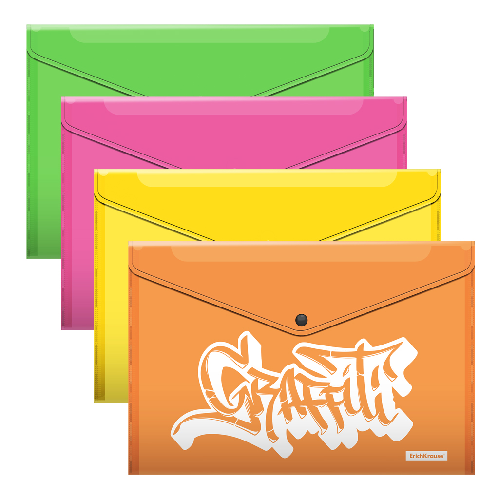 Папка-конверт на кнопке пластиковая ErichKrause® Graffiti, A4, ассорти (в пакете по 12 шт.)