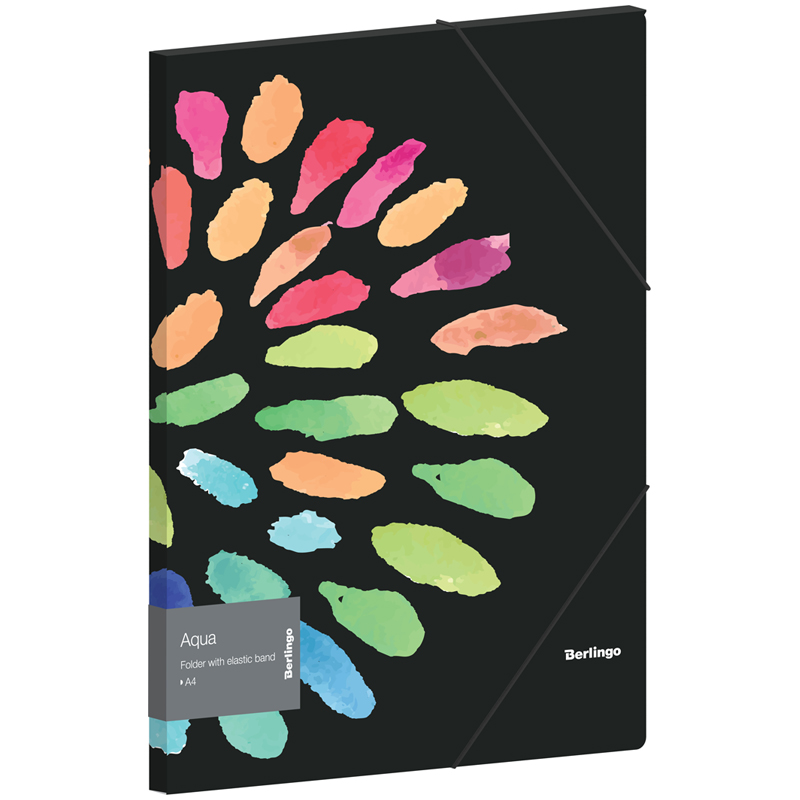 Папка пластиковая на резинках Berlingo "Aqua" формата А4 черного цвета с рисунком. Белый цвет внутренней поверхности. Надежные застежки-резинки черного цвета. Быстрый доступ к содержимому. Изготовлена из высококачественного полипропилена с матовой текстурой поверхности "песок", на которой не видно отпечатков пальцев и мелких царапин. Предназначена для хранения документов. Толщина обложки 600мкм. Папка вмещает до 300 листов. Упакована в индивидуальный прозрачный пакет по форме.