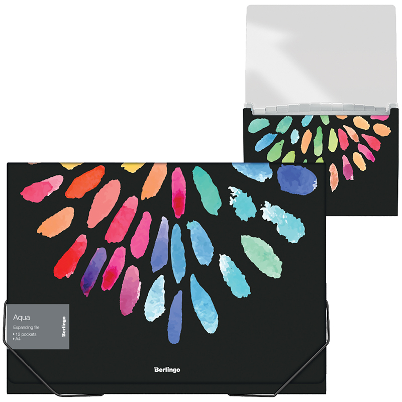 Папка-картотека пластиковая на резинках с отделениями Berlingo "Aqua" формата А4, черного цвета, с рисунком. 12 внутренних отделений для удобного хранения и организации документов. Каждое отделение с индексным полем, позволяет сортировать документы по темам или алфавиту. Надежные застежки-резинки. Белый цвет внутренней поверхности. Быстрый доступ к содержимому. Изготовлена из высококачественного полипропилена с матовой текстурой поверхности "песок", на которой не видно отпечатков пальцев и мелких царапин. Предназначена для хранения и транспортировки документов. Толщина обложки 700мкм. Вмещает до 300 листов. Размер 230*335*35. В комплекте бумажные индексы с английскими буквами с одной стороны и, пустые, для заполнения, с оборотной. Упакована в индивидуальный прозрачный пакет по форме.