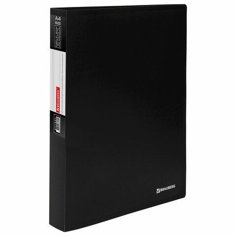 Папка BRAUBERG "Office" солидного черного цвета отлично подходит для хранения документов, составления каталогов, меню и т.п. Для маркировки содержимого на корешок наклеена этикетка. Папка изготовлена из качественного пластика толщиной 0,8 мм с антибликовой фактурой, а ширина корешка составляет 35 мм. Содержит 80 вкладышей, позволяющих хранить документы формата А4 и обеспечивающих их надежную защиту от попадания влаги, пыли и прочих повреждений.