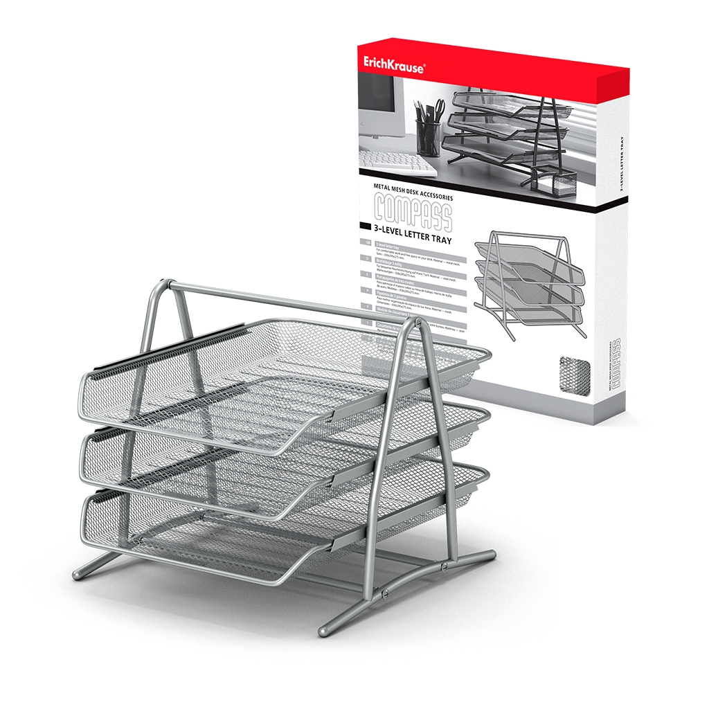 Лоток для бумаг 3-х уровневый металлический ErichKrause® Compass, Classic, серебряный