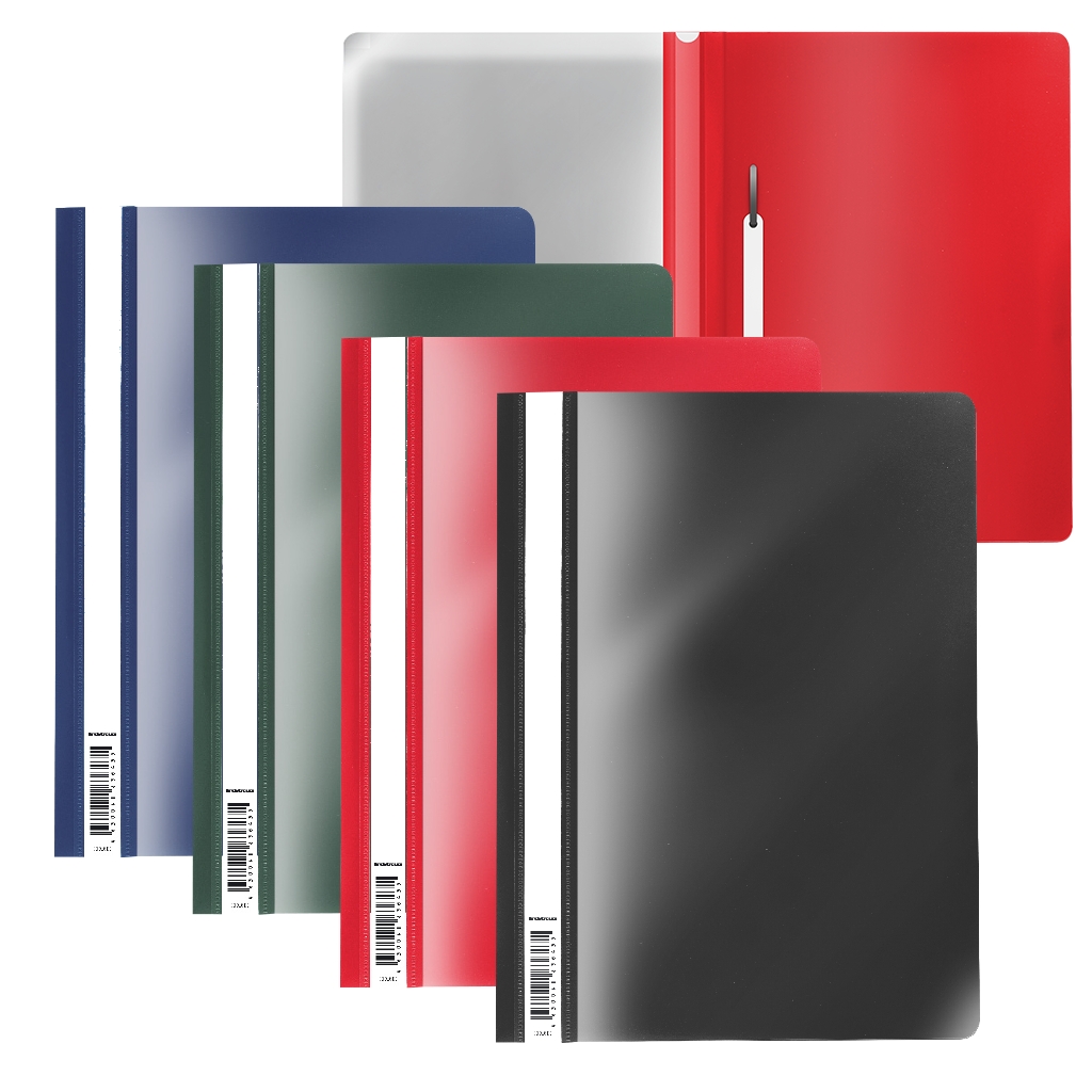 Папка-скоросшиватель пластиковая формата А4 из высококачественного пластика с текстурой поверхности "апельсиновая корка", на которой не видно отпечатков пальцев и мелких царапин. Предназначена для быстрого сшивания, хранения и просмотра документов. Цвет папки – ассорти: черный, синий, зеленый, красный. Механизм - механический скоросшиватель. Папка вмещает до 130 бумажных листов. Размер - 312х230 мм, толщина - 0.14 мм.