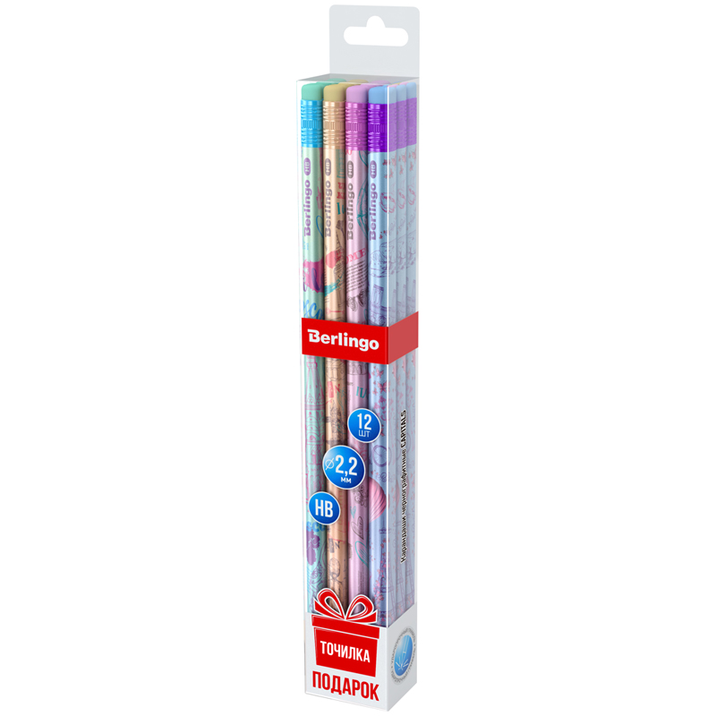 Набор чернографитных карандашей Berlingo Capitals из липы с ластиком и заточкой выполнен в пастельных тонах с изящными рисунками на корпусе. Такой карандаш привлечёт внимание и станет эффектным канцелярским аксессуаром. Матовое покрытие корпуса добавляет особый комфорт при работе. Карандаш создан из специально обработанной древесины для идеальной заточки. Он подходит для черчения и рисования. Карандаш не ломается при падении и безопасен для детей. В подарок точилка для карандашей. - Диаметр грифеля: 2,2 мм, - Твердость: HB, - Заточенный грифель: да, - Форма корпуса: круглая, - Наличие ластика: да, - Цвет дерева: натуральный, - Цвет корпуса: микс из 4-х дизайнов, - Количество штук в упаковке: 12, - Тип упаковки: прозрачная ПВХ-коробка с европодвесом.