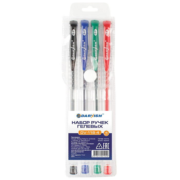 Набор ручек гел. 4цв. "Darvish" корпус прозрачный упаковка на кнопке Пишущий узел 0,7мм. Длина стержня 129мм. Гелевые ручки – это один из прообразов современных тенденций, стремлений к методам, техники совершенно иного письма. Такой ручке присуще гелевая консистенция чернил. Отсюда следует, что качество письма становится намного мягче
