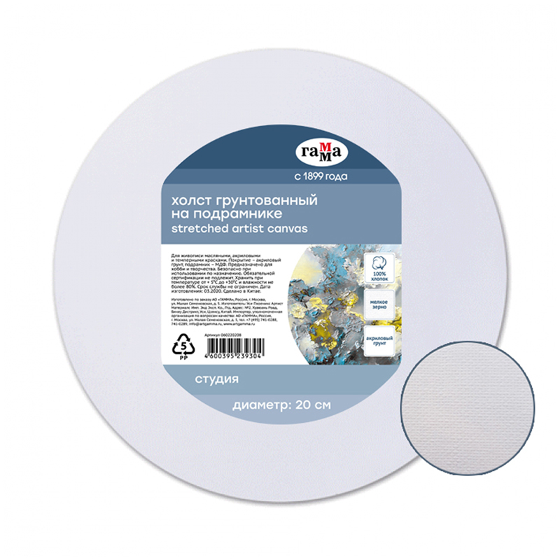 Холст на подрамнике Гамма "Студия", круглый, диаметр 20 см, 100% хлопок, 280г/м2, мелкое зерно