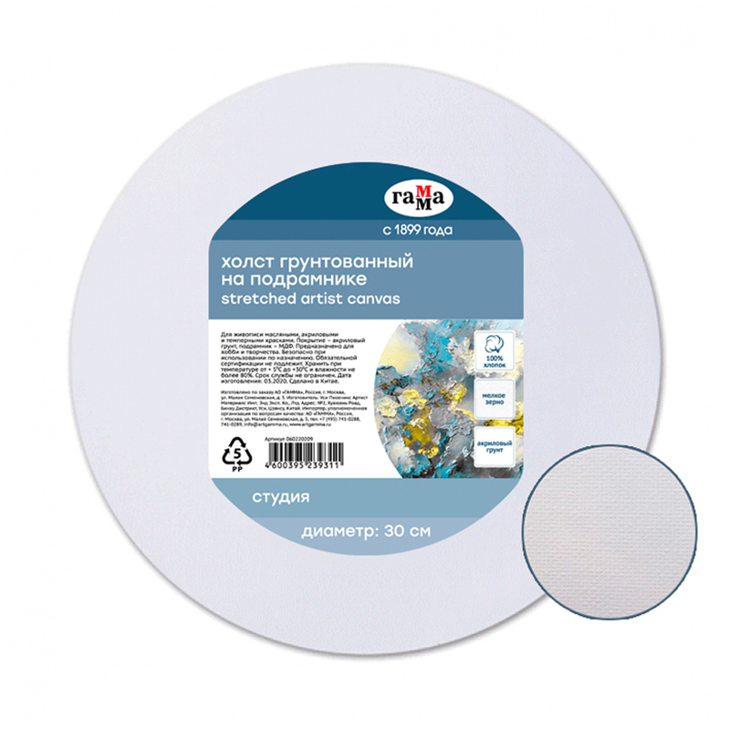 Холст на подрамнике Гамма "Студия", круглый, диаметр 30 см, 100% хлопок, 280г/м2, мелкое зерно