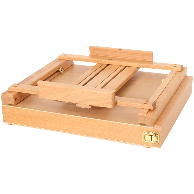 Настольный этюдник с выдвижным ящиком для художественных материалов. Регулировка высоты верхнего фиксатора и нижней полки позволяет работать с большими форматами сидя. Складывается, снабжен ручкой для переноса — удобно хранить и брать с собой. Материал — лакированный бук. Максимальный размер холста?– 86 см.