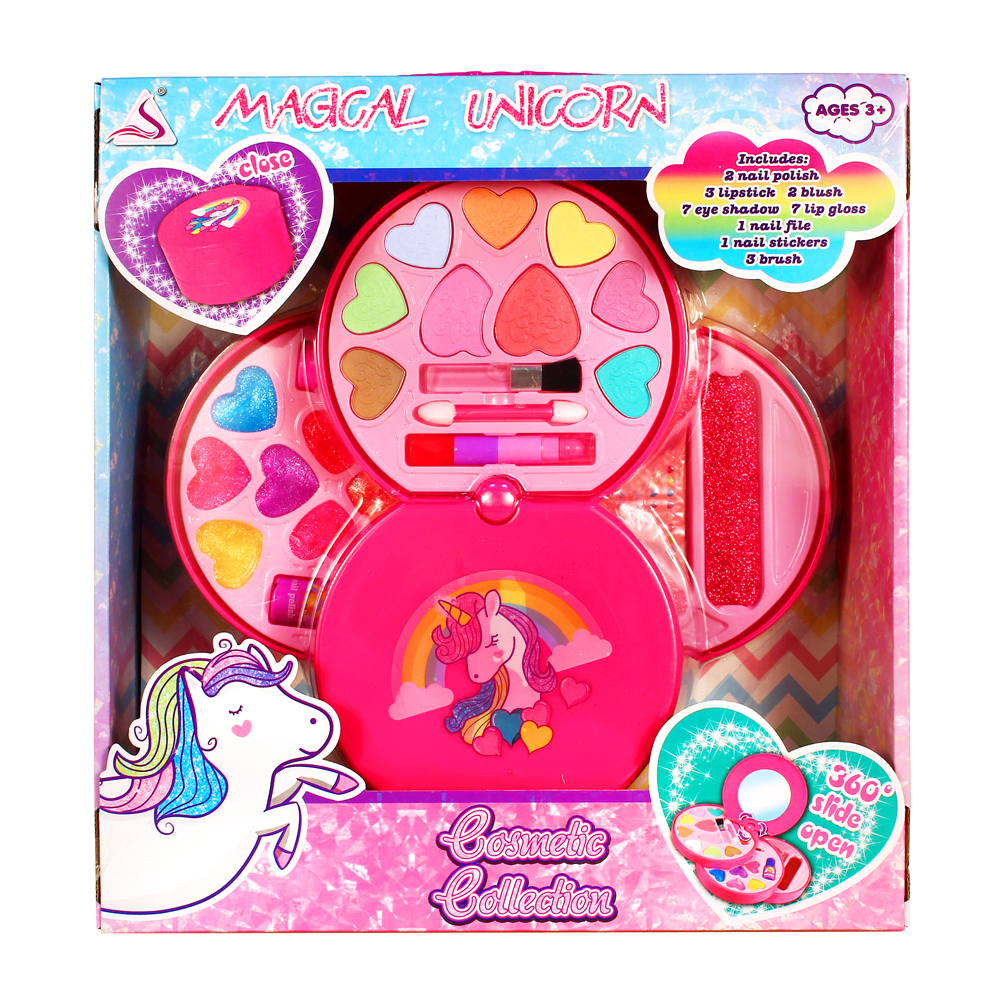 Хочешь по-настоящему преобразиться? Тогда тебе просто необходим набор косметики "Таинстевенный единорог". В нем ты найдешь настоящую трехуровневую палетку с огромным количеством разноцветных теней для век и румян, блесками для губ, лаками и стразами для ногтей. Также в наборе есть кисточка, 2 аппликатора и пилочка для ногтей. Сверкай, как единорог!