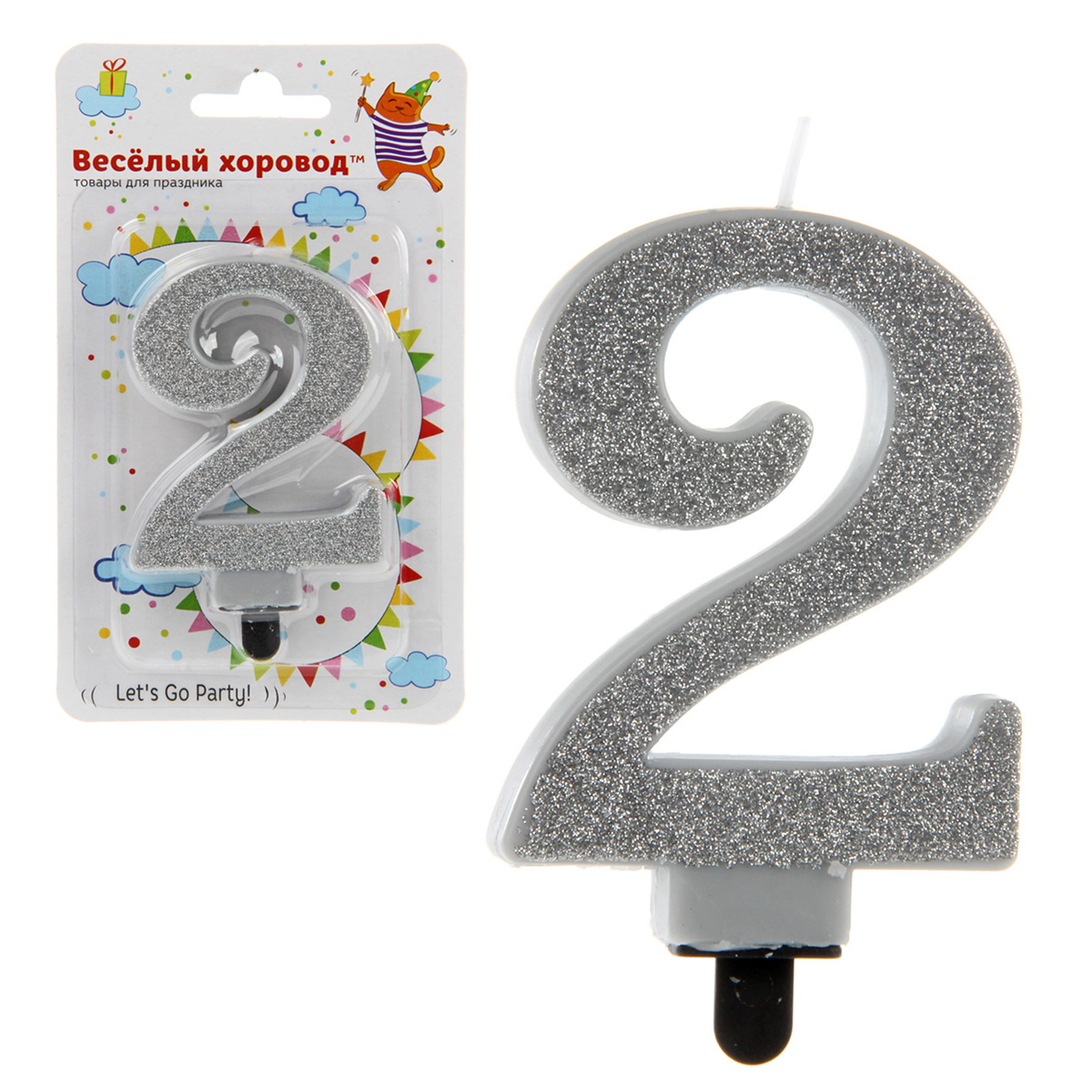 Свеча для торта цифра 2 серебро, глит., подст., 1шт/бл.