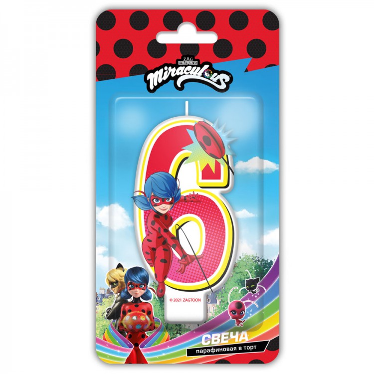 Леди Баг и Супер-Кот. Парафиновая свеча в торт (цифра 6 с героем) в блистере