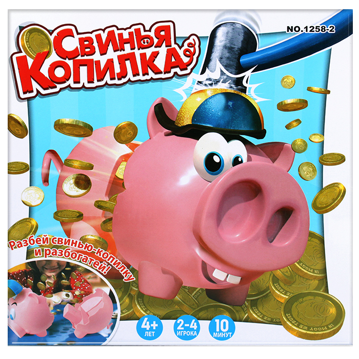 Игра "Свинья копилка". Для игровых целей. Крутите рулетку и выполняйте действия, на которые указала стрелка. Выиграет тот, кто в процессе игры первым разобьет копилку и разбогатеет. Количество игроков 2-4. Возраст 4+. Упаковка - картонная коробка 27*27*13см.