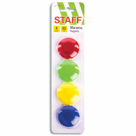 Магниты БОЛЬШОГО ДИАМЕТРА, 40 мм, НАБОР 4 штуки, цвет АССОРТИ, в блистере, STAFF "Basic", 237484