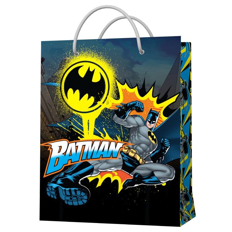 Большой подарочный пакет с изображением супергероя – Бэтмана. Стильный подарочный пакет детский имеет размер 335*406*155 мм – идеален для конструкторов, книг, одежды, игрушек. Подарочный пакет детский (пакет Бэтмен) изготовлен из мелованного картона с ламинацией. Пакет подарочный бумажный имеет привлекательный внешний вид, он поможет родителям решить вопрос с упаковкой подарков на Новый год, день рождения или другой праздник для мальчиков. Пакет «Бэтмен» приведет в восторг ребёнка – поклонника мультфильма о Бэтмане: подарит яркие эмоции и хорошее настроение. Подарочный пакет детский с удобными ручками отличается высоким уровнем качества и надежностью.