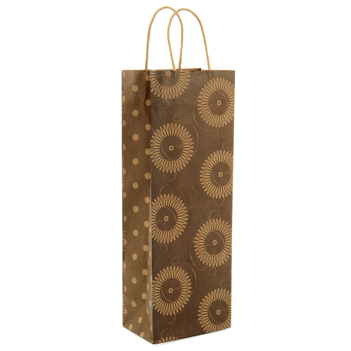Стильный дизайн, удобные ручки - такой пакет идеально подойдет для подарка, который станет выглядеть празднично и роскошно! Можно положить в пакет бутылочку игристого для знатока этого напитка, при желании украсив пакет декоративными аксессуарами, чтобы получилось оригинальное и индивидуальное оформление. Пакет изготовлен из крафтовой бумаги. Размеры пакета: 13*8,5*36 см.