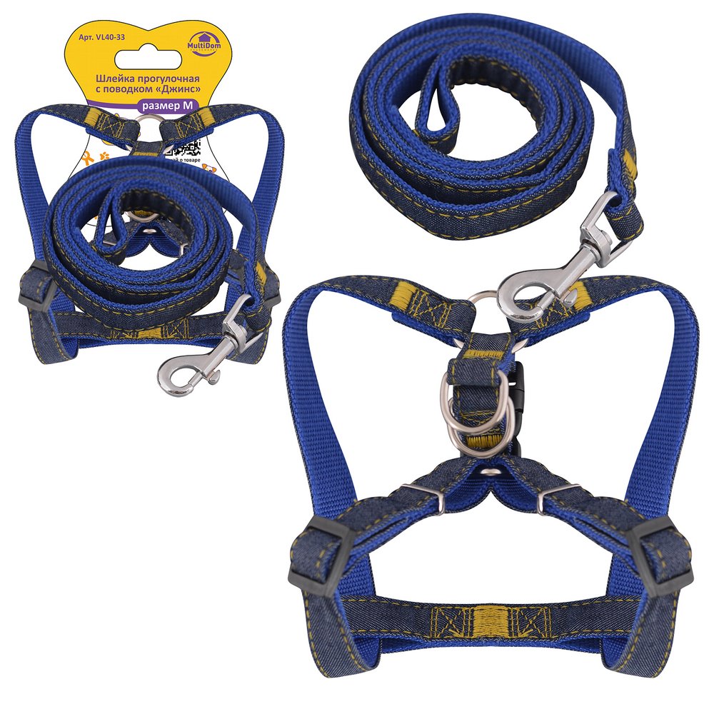Шлейка прогулочная с поводком "Джинс". Размер М