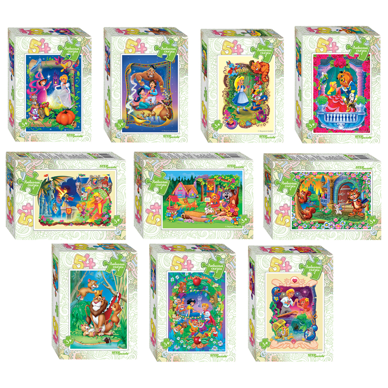 Пазл «Любимые сказки» состоит из 54 деталей и входит в одноименную серию. На картинках мы видим героев всеми нами любимых историй — Короля Льва, Алладина, Русалочку, Кота в сапогах, Красавицу и Чудовище, а также Алису в стране Чудес. Характеристики пазла: стандартные детали пазла (2*1,8см), качественное яркое изображение, экологически чистые, нетоксичные материалы (компания Step Puzzle гарантирует высокое качество пазла и точность подгонки).