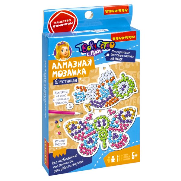 Отправимся в свободный полет фантазии вместе с Bondibon! Алмазная мозаика "БАБОЧКА И ПТИЧКА" – уникальный сверкающий вид творчества! А еще эти многоразовые блестящие наклейки можно клеить на окно. Выкладывание страз прекрасно успокаивает, способствует снижению стресса, а также развивает мелкую моторику и цветовосприятие. Такое творчество привьет ребенку усидчивость и терпение, поможет развитию воображения. Перенесите стразы на основу, используя аппликатор: зацепите стразу с выпуклой стороны и на клейте на выбранный участок. У Вас получатся 2 крупных стикера (9х12 см)– милая птичка и нежная бабочка. Готовые наклейки прикрепите к стеклу с помощью присосок. В наборе для поделок 2 основы, присоски на стекло, многоразовый набор мозаики и инструментов. Превратите творческий процесс в настоящее волшебство. Оцените красочные переливы мозаики на своем окне. Серия Творчество с Луки – отличный подарок для творческих девочек и мальчиков! 5+