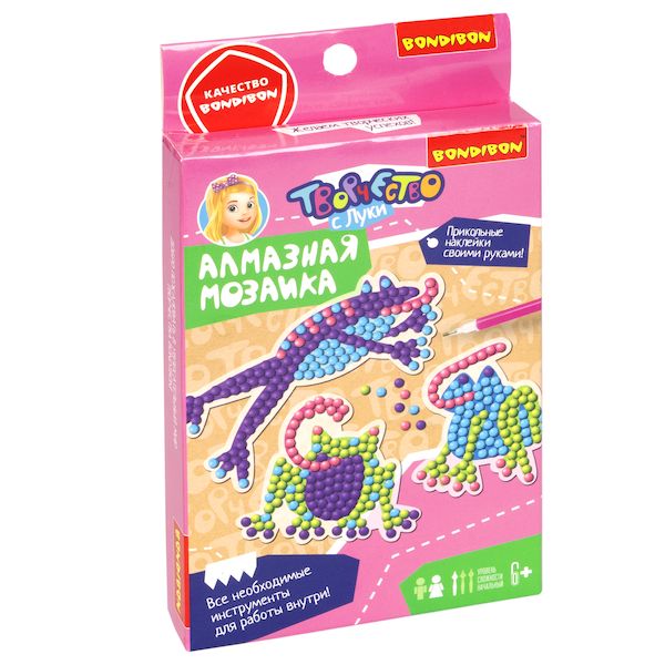 Три веселые лягушки совсем не хотят превращаться в царевну. А зачем? Ведь они уже сверкают королевскими стразами. Уникальный набор для творчества от Bondibon - АЛМАЗНАЯ МОЗАИКА! Красочные переливы каждого алмазика - фрагмента мозаики превращают творческий процесс в настоящее волшебство! Выкладывание страз прекрасно успокаивает, способствует снижению стресса, а также развивает мелкую моторику и цветовосприятие. Такое творчество привьет ребенку усидчивость и терпение, поможет развитию воображения. Перенесите стразы на основу, используя аппликатор: зацепите стразу с выпуклой стороны и наклейте на выбранный участок. У Вас получатся 3 крупных стикера с лягушатами. Собери свой комплект наклеек и укрась ими дневник, телефон, любимый блокнот и многое другое. В наборе для поделок цветные основы, набор мозаики и инструментов, инструкция. Серия Творчество с Луки – оригинальный подарок для творческих девочек и мальчиков! 6+