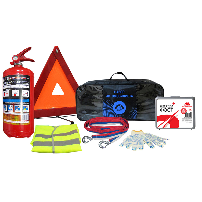 Набор автомобилиста состоит из компактной сумки-саквояж с двумя прозрачными окошками, что позволяет увидеть все что находиться в сумке, Аптечка первой помощи автомобильная «ФЭСТ» в пластиковом футляре, треугольного знака аварийной остановки со светоотражающей функцией, переносного огнетушителя ОП-2, буксировочного троса (3,5 тонн) сдвумя металлическими крюками, жилет сигнальный, рабочих перчаток.
