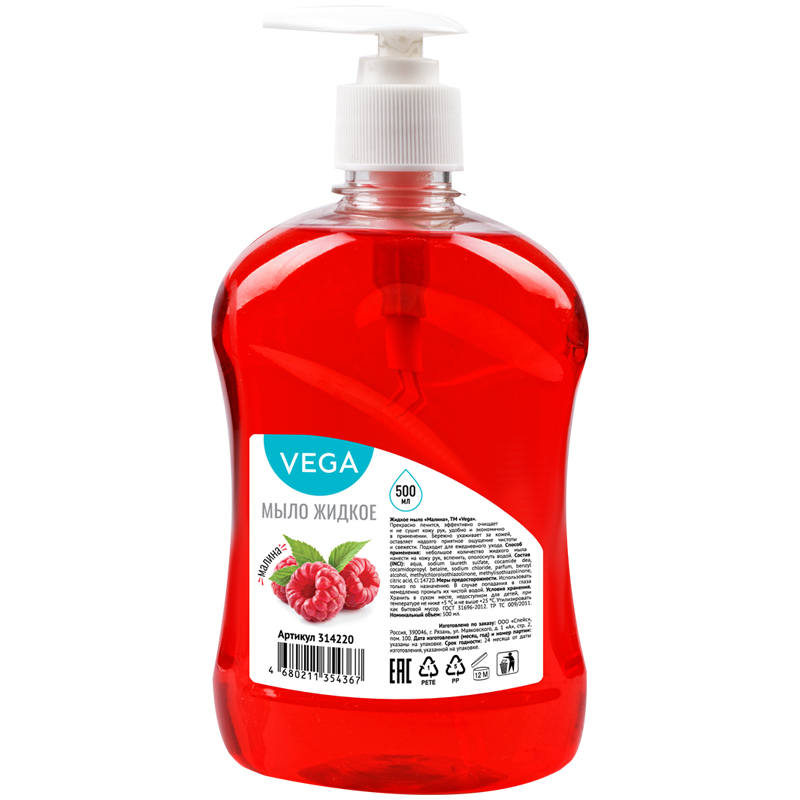 Мыло жидкое Vega "Малина", с дозатором, 500мл.