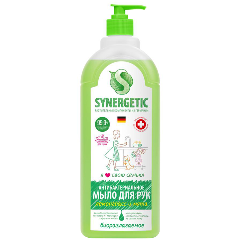 "Мыло жидкое Synergetic ""Лемонграсс и мята"", биоразлагаемое, антибактер., антизапах., с дозатором, 1л"