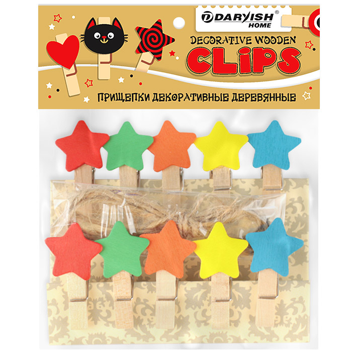 Прищепки декоративные деревянные "Звездочка" 10шт/уп + шпагат 1,40 см (набор). Прищепка h3.5 см.Размер упаковки 12*13,5см, европодвес.Предназначены для рукоделия, украшения и отделки, как самостоятельный элемент или для крепления различных деталей в скрапбукинге, кардмейкинге, флористике и других техниках.