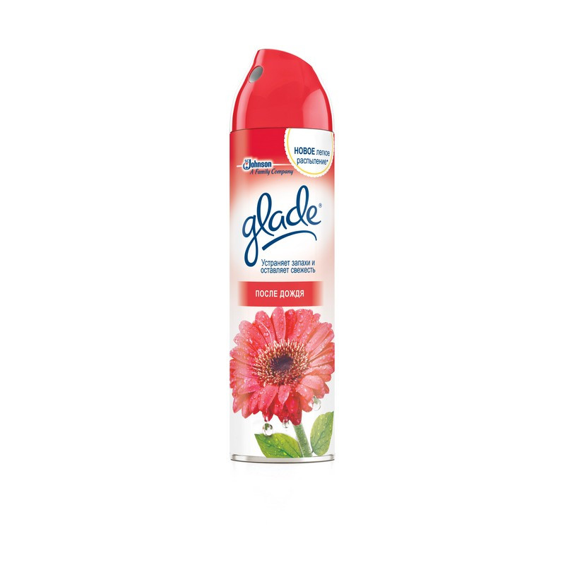 Освежитель воздуха (аэрозоль) Glade «После дождя» наполняет помещение приятным ароматом и маскирует неприятные запахи, освежает воздух. Баллон имеет объем 300 мл. Не содержит озоноразрушающих веществ. Освежитель воздуха протестирован, не рекомендуется использовать для ткани.