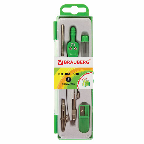 Металлическая готовальня предназначена для учеников младших и средних классов. В состав готовальни входят 5 предметов: циркуль - 125 мм, рейсфедерная вставка, игольная вставка, точилка, запасной грифель. Количество предметов: 5. Упаковка набора: пенал с прозрачной крышкой. Длина циркуля: 125 мм. Материал изготовления: металл. Цвет деталей: зеленый Бренд - BRAUBERG. Производитель - Китай. Артикул - 210336. Штрихкод - 4606224052427