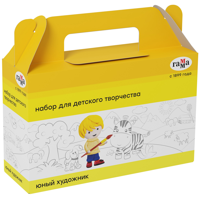 Набор для детского творчества в яркой коробке с ручкой и фирменным дизайном включает в себя 5 продуктов серии "Юный художник". Состав набора: Акварель "Юный художник", 8цветов, Пластилин ЮНЫЙ ХУДОЖНИК, 12цветов, Гуашь "Юный художник", 6 цветов, Кисть, Раскраски на картоне А5.