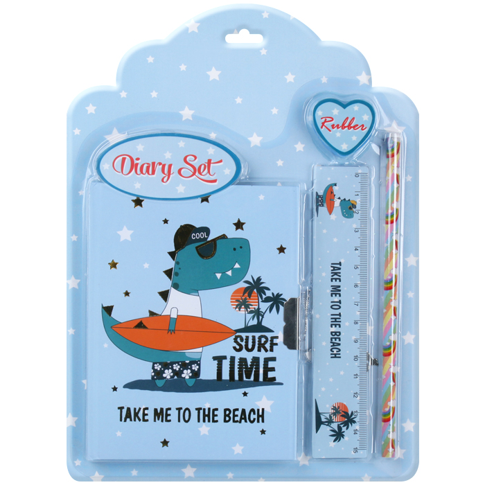 Набор канцелярский "Динозаврик" 4предмета: блокнот (11*15см) на замочке, 50листов, офсет, не менее 70г/м2, линейка (15см), карандаш, ластик. Ассорти. Упаковка 18,5*26см , европодвес.