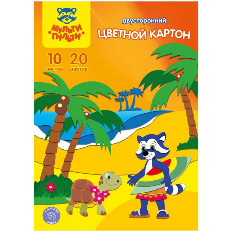 Картон цветной двусторонний A4, Мульти-Пульти "Енот на о. Гавайи", 10л., 20цв., мелованный, в папке КЦ10-20цдв_16366